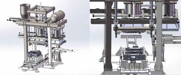 Sand scraping (cleaning sand) → downward pressure of the air injection head → Air injection → solidification of the sand core → retraction of the combined module (core removal and reset) → top mold (sand mold remaining in the mold) → first mold opening 20-50mm (sand core demolding) → second mold opening/air injection head rising → lower mold sliding out (reset)/sand injection head entering → lower mold top core (sand Демолсиране на основата) → Отстраняване на ядрото извън машината → ⒆ Време за отстраняване на безопасното ядро → ⒇ По -ниска плесен Нулирайте горната ядро